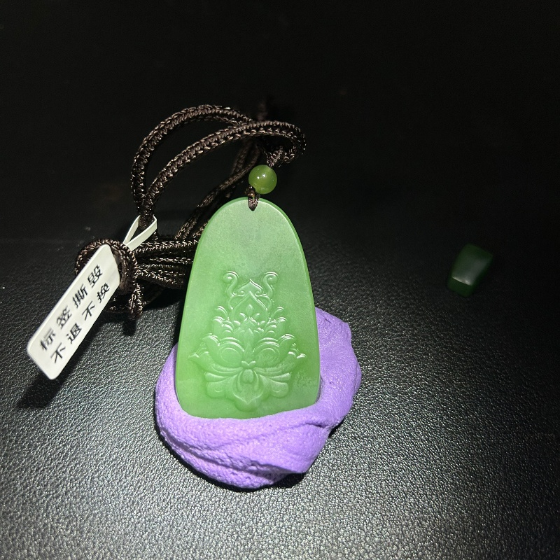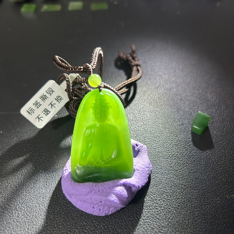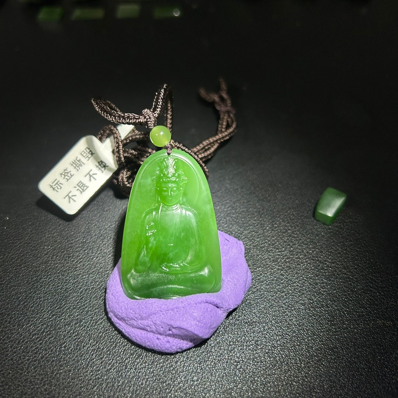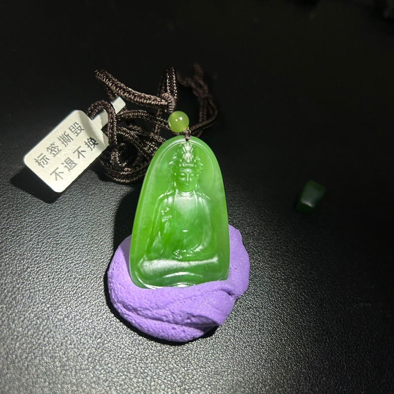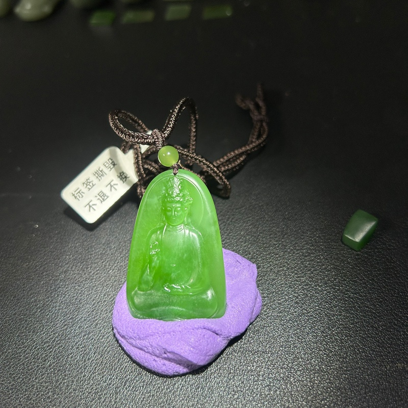Heitan jade, Russia, emerald green color, interlayer ice-aged material, plain-cloth Guanyin figure
